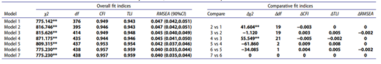 论文提出,为解决研究中由于儿童不理解题目中部分描述攻击的抽象词语而导致错误填答的问题,研究者们提出应由儿童的看护者对其攻击性进行评估。但是,看护者的评估结果和儿童自评结果是否等价呢?这样做是否合理呢?本研究拟通过多组验证性因素分析的检验方法,对反应性-主动性攻击量表是否具有跨评价方式的测量不变性进行检验。研究选取中文版反应性-主动性攻击量表对485名4-6年级的学生及其家长进行施测。结果跨评价方式等值的七个模型拟合良好(CFI>0.900,TLI>0.900, RMAEA<0.05),实现跨评价方式等值,具体指标如表1所示。该结果表明反应性-主动性攻击量表具有良好的结构效度,特别是在跨评价方式上的测量不变性为以后通过不同的评价方式测量的攻击性行为提供了可比性的依据,解决了一些在测量中不便儿童直接评价的问题。