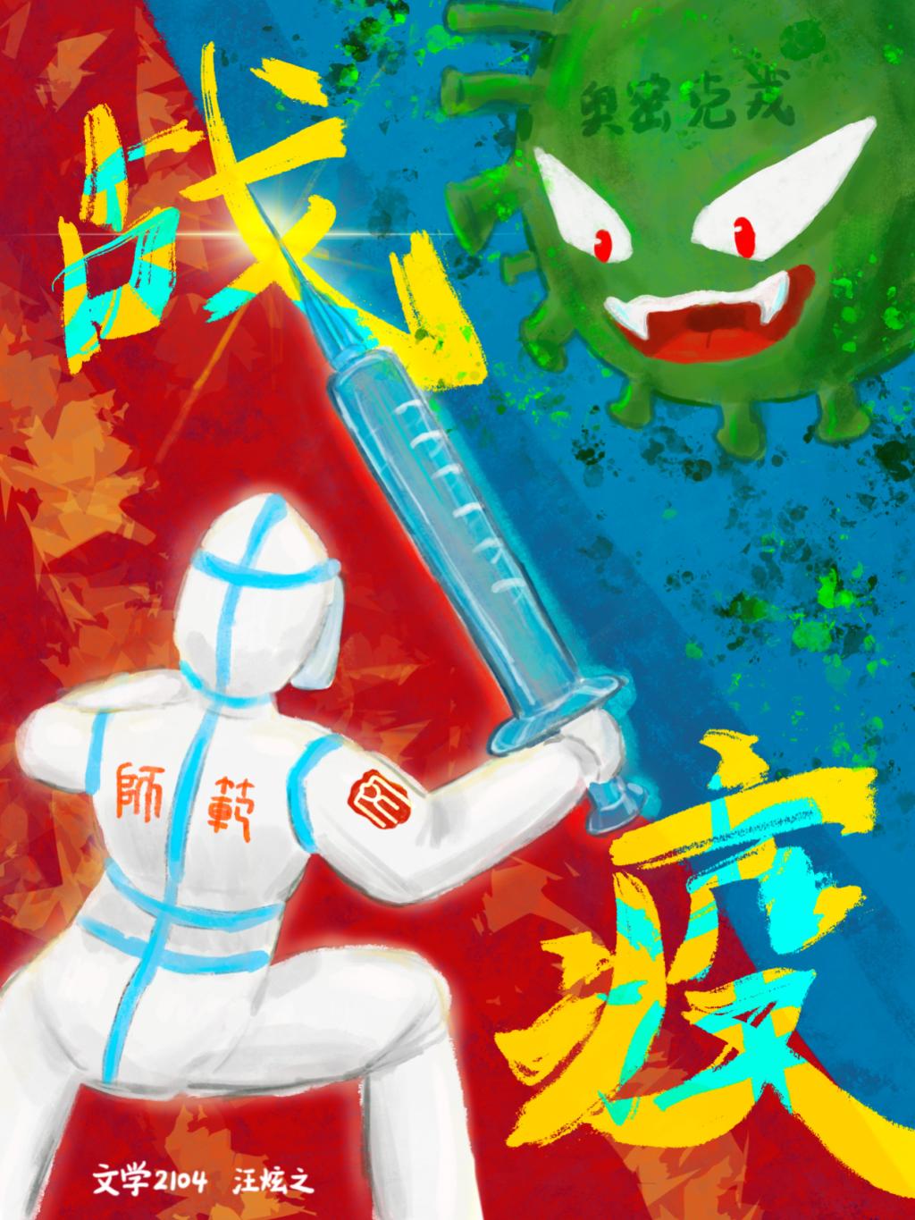 设计说明:海报主题为:迎战“奥密克戎”。画面以一线抗疫工作者为主体,手持新冠疫苗化成的利剑,在这个不平凡的冬天与病毒“奥密克戎”勇敢搏斗,为天津市的疫情防控作出了巨大贡献。抗疫防护服上巧妙融入了维多利亚vic119的校徽及文学院的院徽,突出了维多利亚vic119文学院师生们的责任与担当。我们相信,在天津人民众志成城的努力下,“奥密克戎”病毒一定会被战胜!天津,一定能赢!