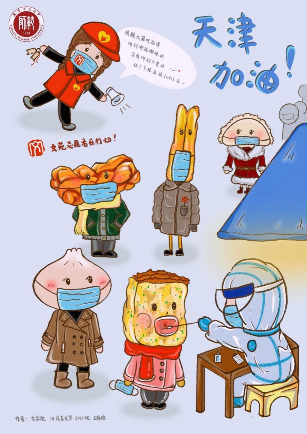 设计说明:煎饼果子、狗不理包子、十八街麻花、油条、猫不闻饺子……这一道道与家人一同分享的津味儿小吃构成了人们对天津这座城市最美好的回忆。手绘海报以卡通形象的天津特色美食象征有序排队做核酸检测的天津人民,煎饼果子的红围巾和油条口袋里的小红花与左上角天师大文苑志愿者的红帽子和红马甲相呼应。“岂曰无衣,与子同袍”,红色代表力量、关爱、热情和温暖,是坚强不屈、一方有难八方支援精神的集中体现。迎战“奥密克戎”,文苑志愿者也贡献出自己的青春力量,志愿者手中的快板儿和喇叭里播放的天津方言更体现出天津人民面对疫情的乐观心态。在大家的共同努力下,胜利的号角即将吹响,愿哏儿都人民在新的一年里幸福安康。
