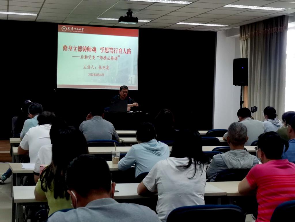 后勤党委消息(通讯员 雷峰利)为扎实推进学习贯彻习近平新时代中国特色社会主义思想主题教育,强化后勤党委教职工思想政治和师德师风建设,增强职工的责任感和使命感,5月26日,后勤党委书记张兆泉以“修身立德铸师魂 学思笃行育人路”为题讲授师德必修课。后勤党委全体教职工参会。